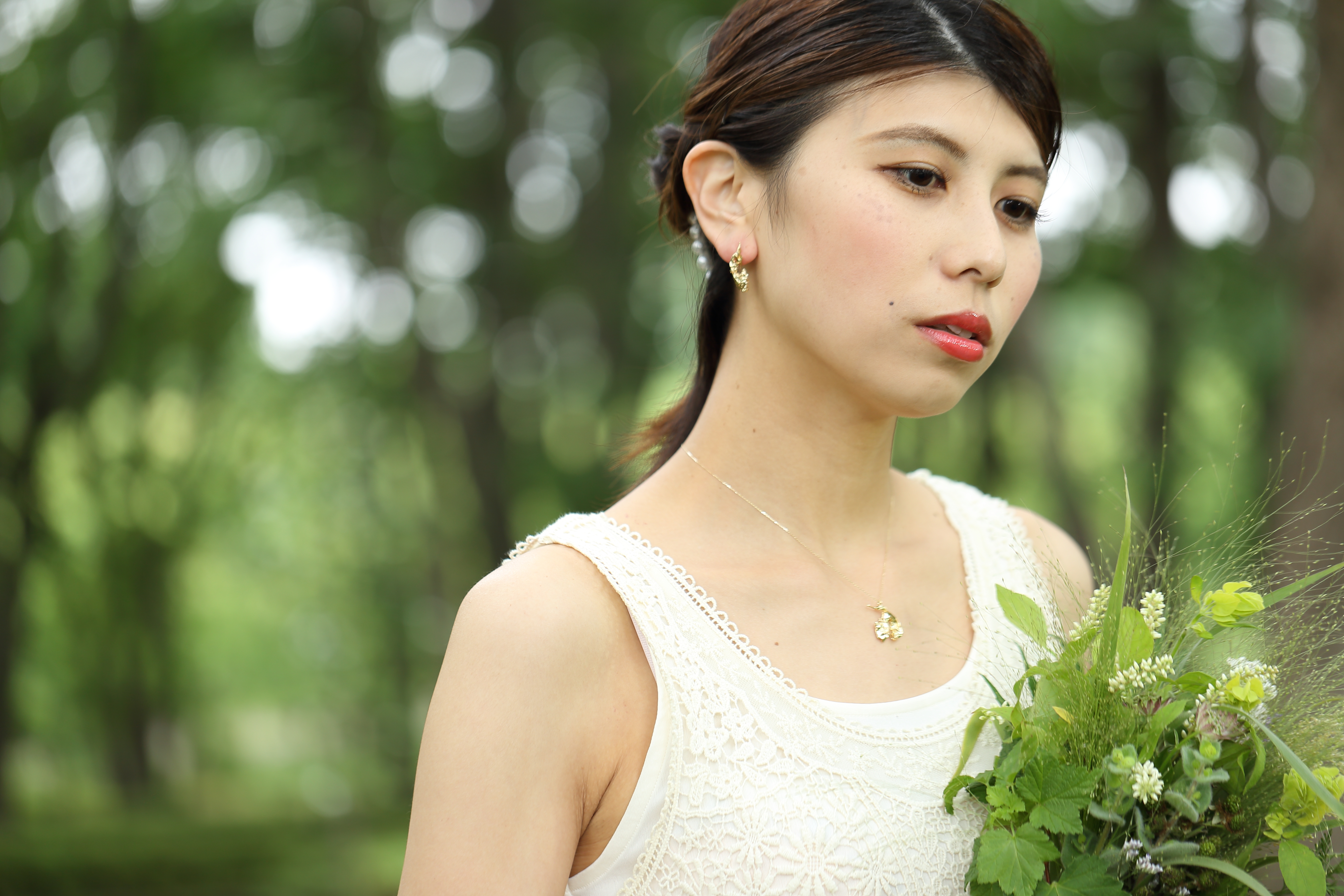 Lobularia(ロブラリアピアス)M サイズ:約2.6㎝×約1.1㎝ 仕様:ポストタイプ 価格:SV925+K18YG plating \10,000(税抜き) Lobularia「ロブラリア」スイート・アリッサムのお花を原型として金属にして作ったピアス。花の繊細な部分や葉脈を表現しております。花からそのまま原型を取ることによって表現出来たピアスとなっております。