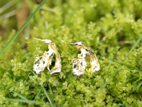 Lobularia folium(ロブラリアフォリウムピアス) サイズ:約2.0㎝×約1.5㎝ 仕様:ポストタイプ 価格: SV925+K18YG plating \10,000(税抜き) SV925+ロジウムplating\10,000(税抜き) Lobularia folium 「ロブラリアフォリウム」スイート・アリッサムのお花の葉っぱを原型として金属にして作ったピアス。葉っぱの繊細な葉脈やフォルムを表現しております。葉っぱの原型をそのまま取ることによって表現出来たピアスとなっております。